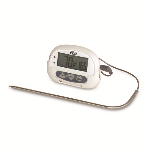 Digital Probe Thermometer, 32 to 392°F (0 to 200°C), 5-1/2" (14.0cm) probe with 3' (91.4cm) sensor cable, shatterproof, dual progress display, big digit, alarm, audio/visual, sliding mode switch, temperature guide on package, magnet/stand, food-safe ABS, 304 stainless steel probe